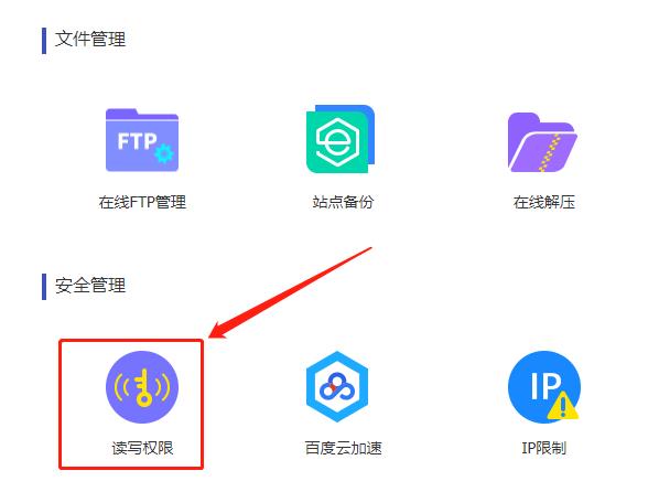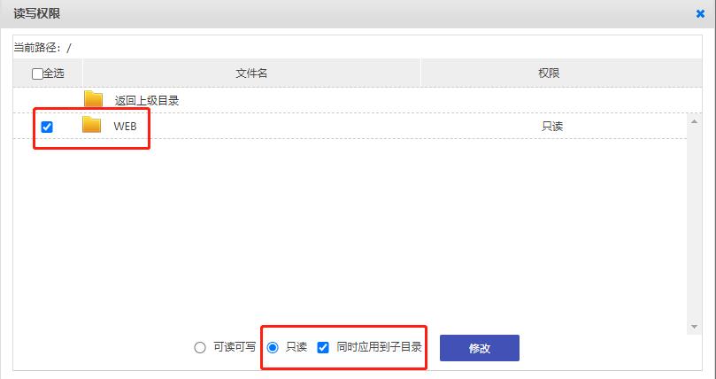 找到【讀寫權(quán)限】并打開,將網(wǎng)站根目錄設(shè)置為只讀,然后將Data和Upload目錄設(shè)置為可讀寫